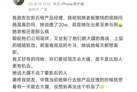 一位网友发文透露:“我朋友在影石担任产品经理,确认老板确实撒了20万。”凤凰网财经《公司研究院》多次致电影石创新求证,但电话未获接通,邮件亦未收到回复。